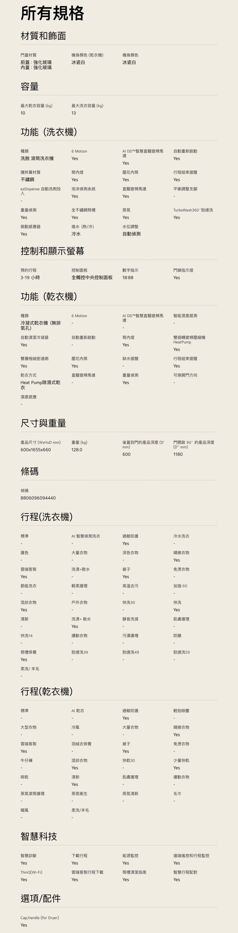 鎰銘電器-LG WashTower™ AI 智控洗乾衣機 熱泵除濕 WD-S1310W(冰瓷白)