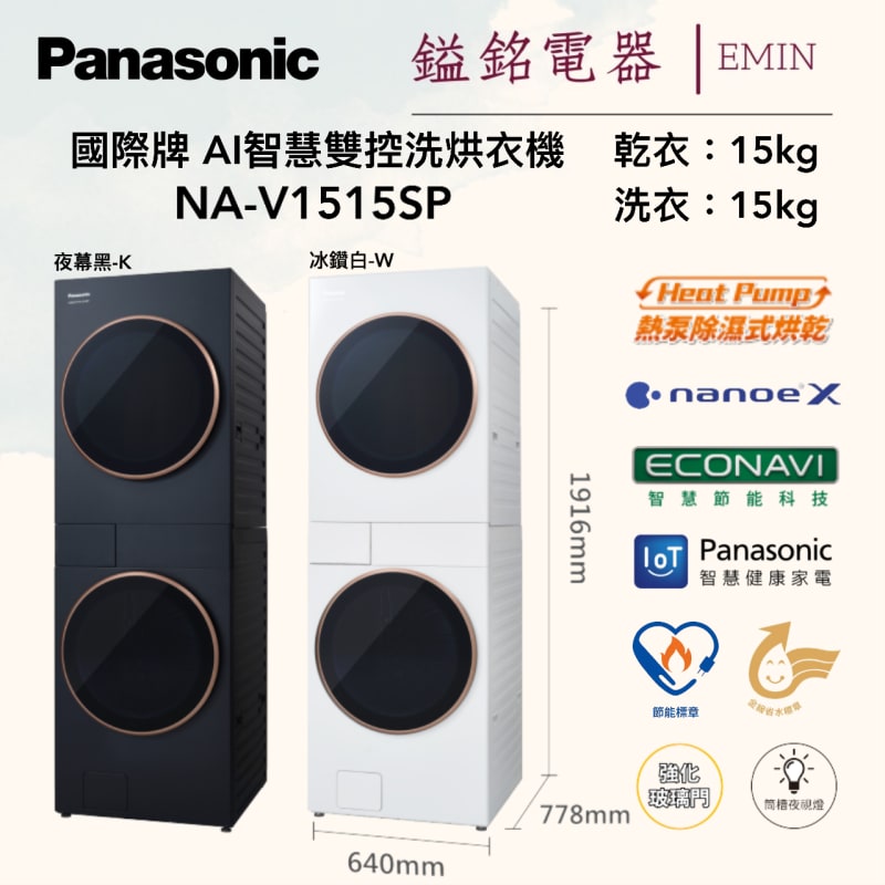 鎰銘電器-國際牌 panasonic AI 智慧雙控洗烘衣機 NA-V1515SP-W白色/K黑色
