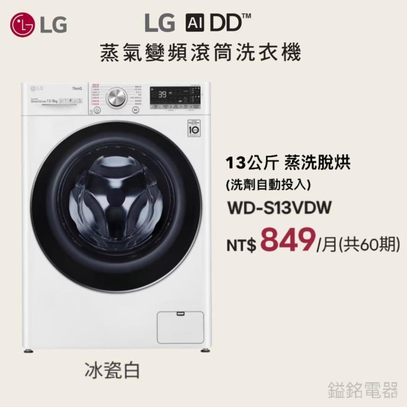 鎰銘電器-LG 滾筒洗衣機蒸洗脫烘 冰磁白 WD-S13VEW / 13公斤